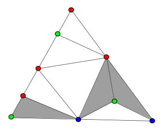 The setup: take a triangle3. Subdivide it into a mosaic of smaller triangles. Color every corner of every small triangle using three colors, let’s call them red, blue, green, with these rules: each outer corner of the big triangle gets its own dedicated color, corners on an outer edge can only be one of the two colors at that edge’s endpoints, and interior corners can be anything. (Interior corners have more freedom. This is their one win.)